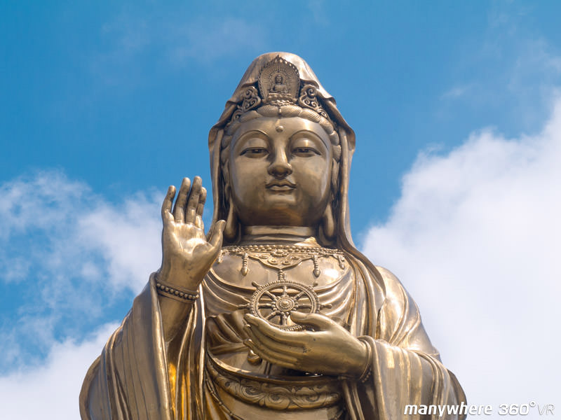 Nanhai Guanyin Statue located at the southernmost edge of Mount Putuo, across the sea from the nearby Zhujiajian Island, this statue of the Goddess of Mercy has a solemn appearance, with eyebrows like a crescent moon and the eyes of compassion. Her left hand is holding Wheel of Dharma while the right hand is casting Abhaya-Mudra 施无畏印, standing on top of the lotus seat, with a Amitabha Buddha on top of her head.