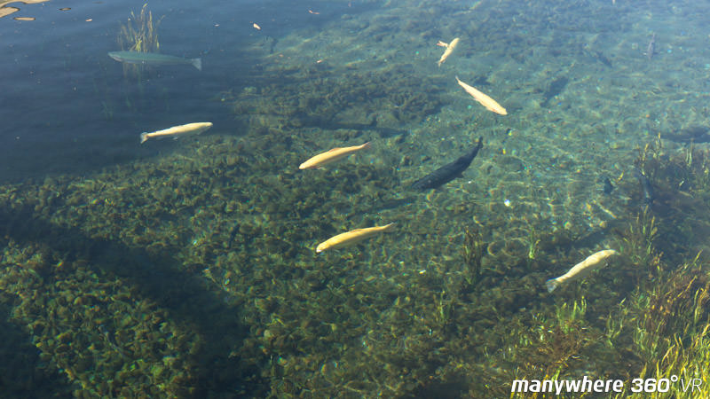 The eight ponds of the Oshino Hakkai Springs are of different sizes and shapes. Except for the Deguchiike Pond 出口池 (Exit Pond), which is far from the center, the remaining seven are all located in the central area of Oshino Village, and they are: Okamaike Pond お釜池, Sokonashiike Pond 底抜池, Choshiike Pond 銚子池, Wakuike Pond 湧池, Nigoriike Pond 濁池, Kagamikke Pond 鏡池, Shobuike Pond 菖蒲池. The Wakuike Pond (Gushing-out Pond) is the most representative spring in the Oshino Hakkai, named after the considerable amount of water that gushes from the bottom of the pond. Okamaike Pond (Cauldron Pond) is the smallest in size, with bubbles constantly rising from the bottom of the water, as if it were boiling water in a hot pot. Choshiike Pond (Pot Pond) is similar in shape to a wine pot. Shobuike Pond (Calamus Pond) is full of calamus, together with flowers that bloom every summer.