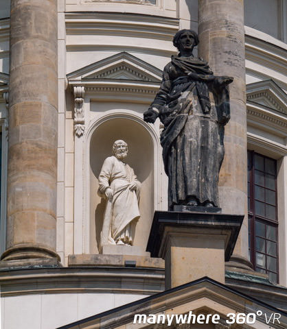 The French Church (Französischer Dom) and German Church (Deutscher Dom) are located at the north and south ends of the square, which were designed and built in 1701. In 1785, the two churches added a dome tower with the same appearance simultaneously, all of which were preserved when rebuilt after the war. Today there is an exhibition on German history in the German church, and the French church has a restaurant, a viewing platform and Huguenot museum.