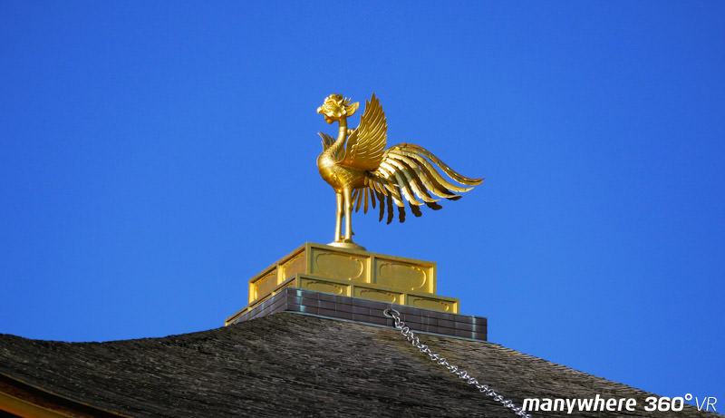 The Kinkakuji Temple is centered on a Golden Pavilion, and the three-story pavilion uses three different construction styles: The first floor, called The Chamber of Dharma Waters 法水院, is evocative of the Shinden palace style, with a seated statue of Ashikaga Yoshimitsu; the second floor has a statue of Kannon Bosatsu and the Four Heavenly Kings housed in The Tower of Sound Waves 潮音洞, which is built in the style of warrior aristocrats. The third floor, Cupola of the Ultimate 究竟頂, is built in the style of Zen Buddhism, and dedicated to the relics of Sakyamuni Buddha. On the top of the pagoda-shaped Golden Pavilion, there is an exquisitely crafted golden phoenix ornament.