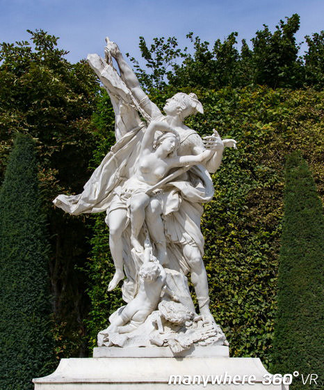 The gardens on the west side of Versailles were the favorite of Louis XIV, with classical-style sculptures and fountains and a cross-shaped canal stretching nearly three kilometers. Inside the Versailles Gardens, fountains of the Chariot of Apollo, Poseidon and Latona are priceless historical and artistic treasures. Scattered throughout the 800-hectare garden area are also the Grand Trianon, Petit Trianon, the Hamlet of the Queen, and many pavilions.